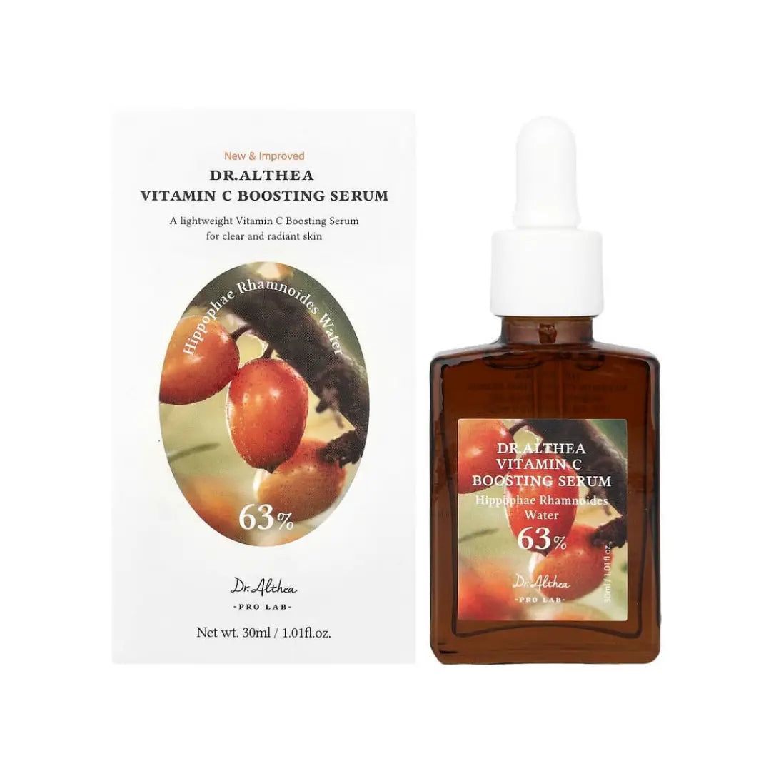 سيروم دكتور ألثيا المعزز بفيتامين سي هو تركيبة خفيفة الوزن تعزز إشراقة البشرة، مصممة لتحقيق بشرة صافية ومتألقة. يحتوي على 63% من ماء نبات نبق البحر، مما يوفر فوائد قوية لتفتيح البشرة ومضادات الأكسدة، بينما يضمن حمض الهيالورونيك الثلاثي توازنًا مثاليًا للرطوبة وترطيبًا يدوم طويلًا.