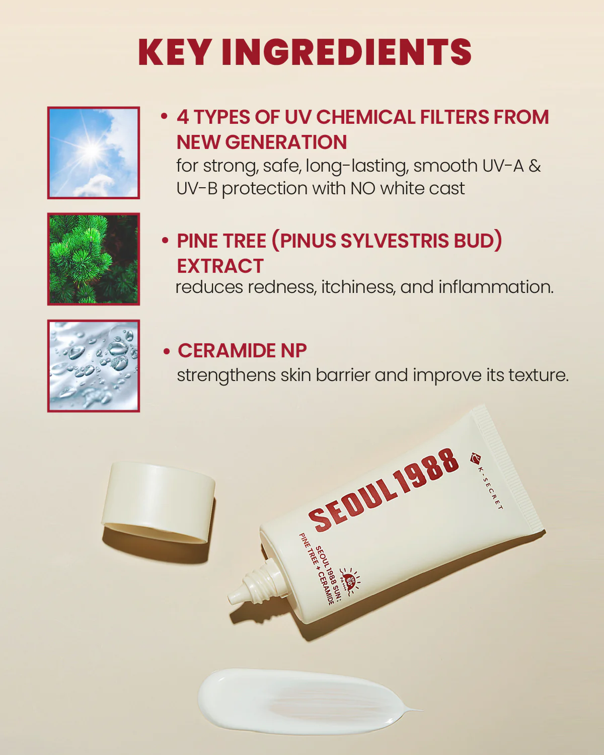 A sunscreen offering SPF 50+ PA++++, enriched with pine tree extract and ceramide, soothes irritated skin and strengthens the skin barrier.