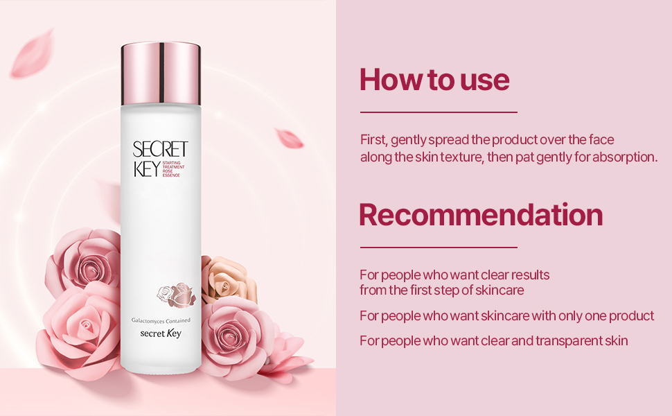 The Secret Key Starting Treatment Rose Essence is a revitalizing skincare product that delivers abundant moisture and refreshes the skin. Infused with Galactomyces Ferment Filtrate and Rosa Centifolia Flower Water at 20,045 ppm, this essence deeply hydrates and revitalizes the skin, improving its overall condition. The formula also includes hydrating ingredients which enhance moisture retention, leaving the skin smooth and refreshed. Lightweight and gentle, this essence is designed to absorb quickly, providing an instant boost of hydration and preparing the skin for the next steps in your skincare routine.