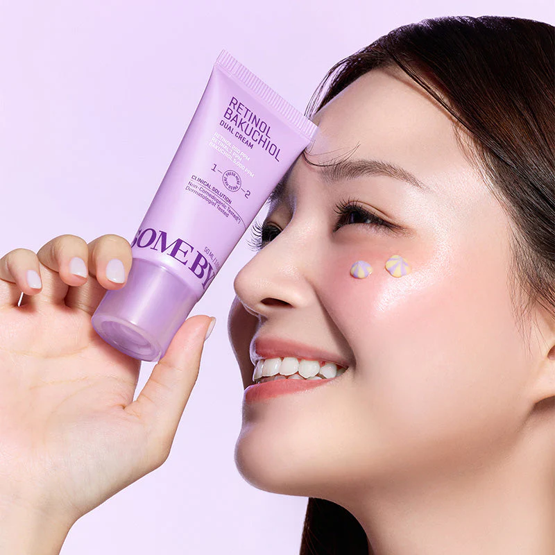 SOME BY MI Retinol Bakuchiol Dual Cream is a two-step cream combining the power of retinol, retinal, and bakuchiol to promote firmness, smooth texture, and refine pores. The dual-tube design keeps each phase stable: Step 1 focuses on firming and barrier support, and Step 2 delivers nourishment and hydration.