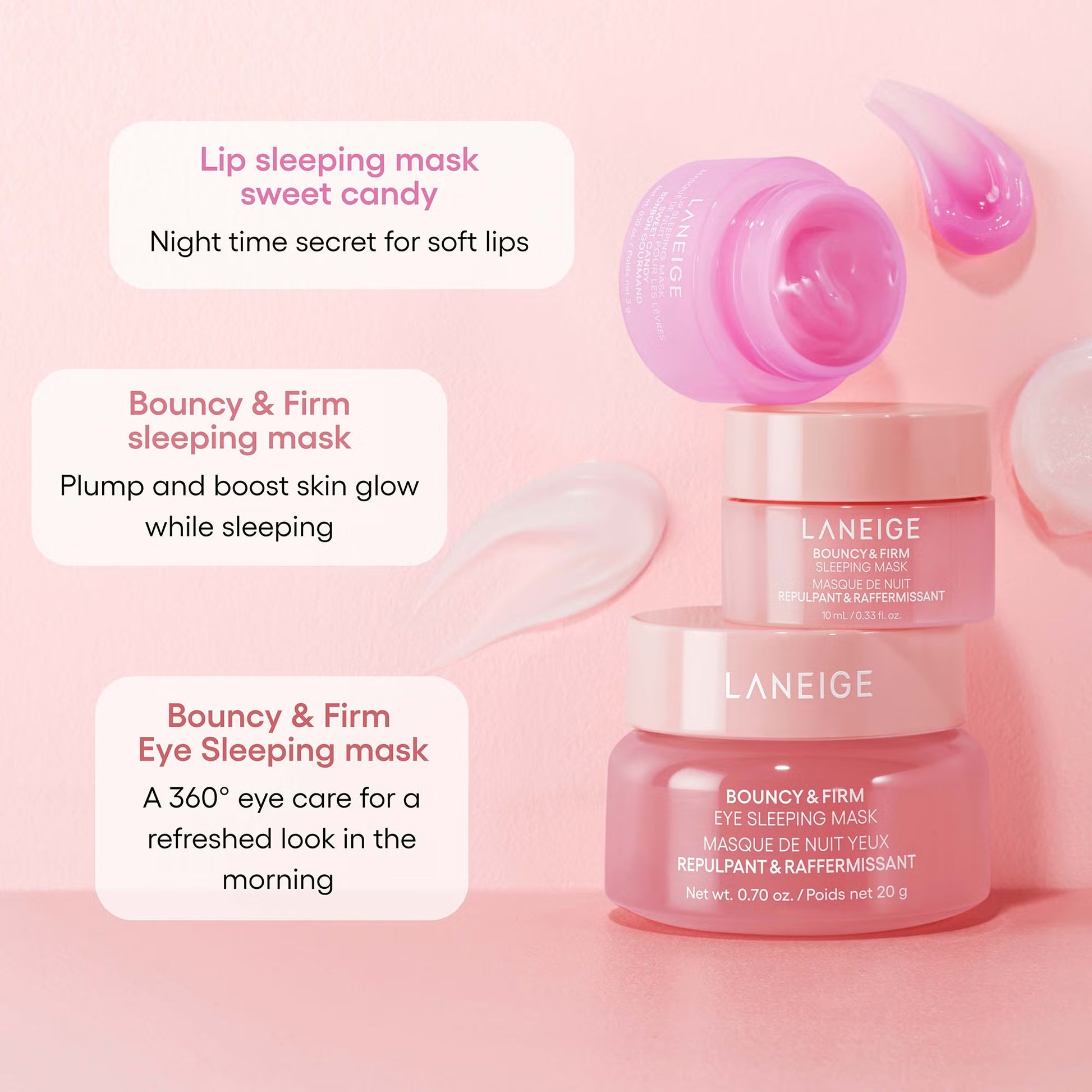 Embrace slow aging with LANEIGE’s Plump Hydrate Trio Set. Formulated with Peony and Collagen Complex™, the BouncyFirm Sleeping Mask strengthens your skin’s barrier and softens fine lines and wrinkles. The Bouncy Firm Eye Sleeping Mask depuffs and rejuvenates your under-eye area. Swipe the Lip Glowy Balm across your entire lips for that glossy effect.